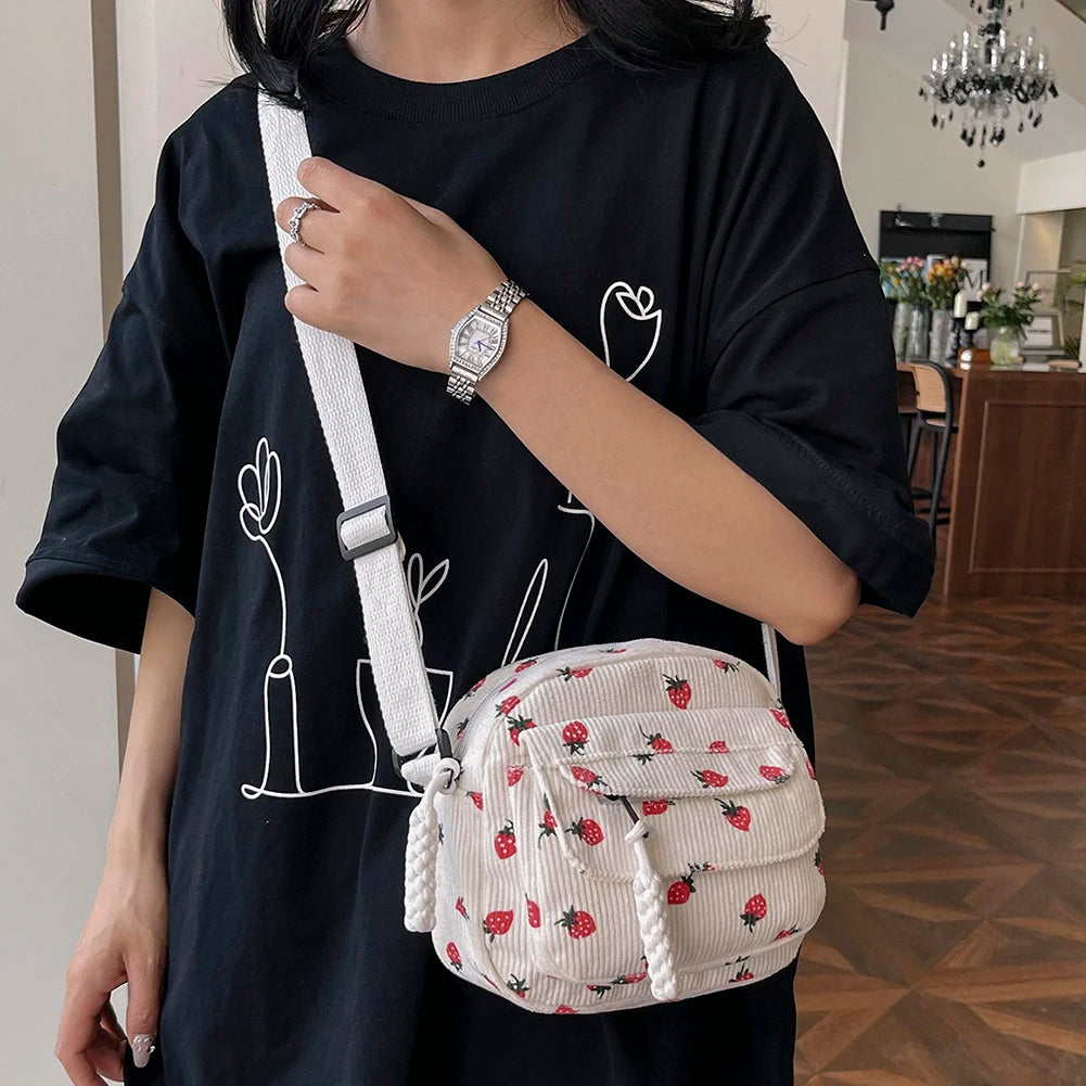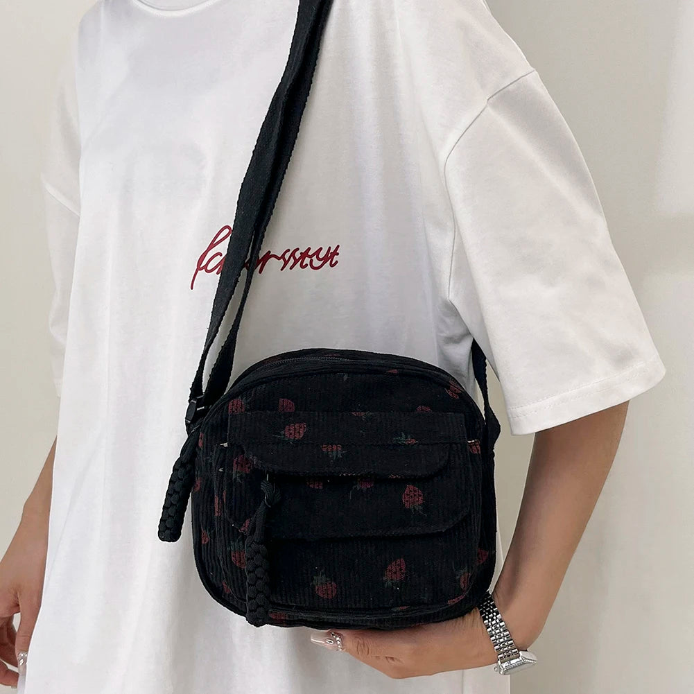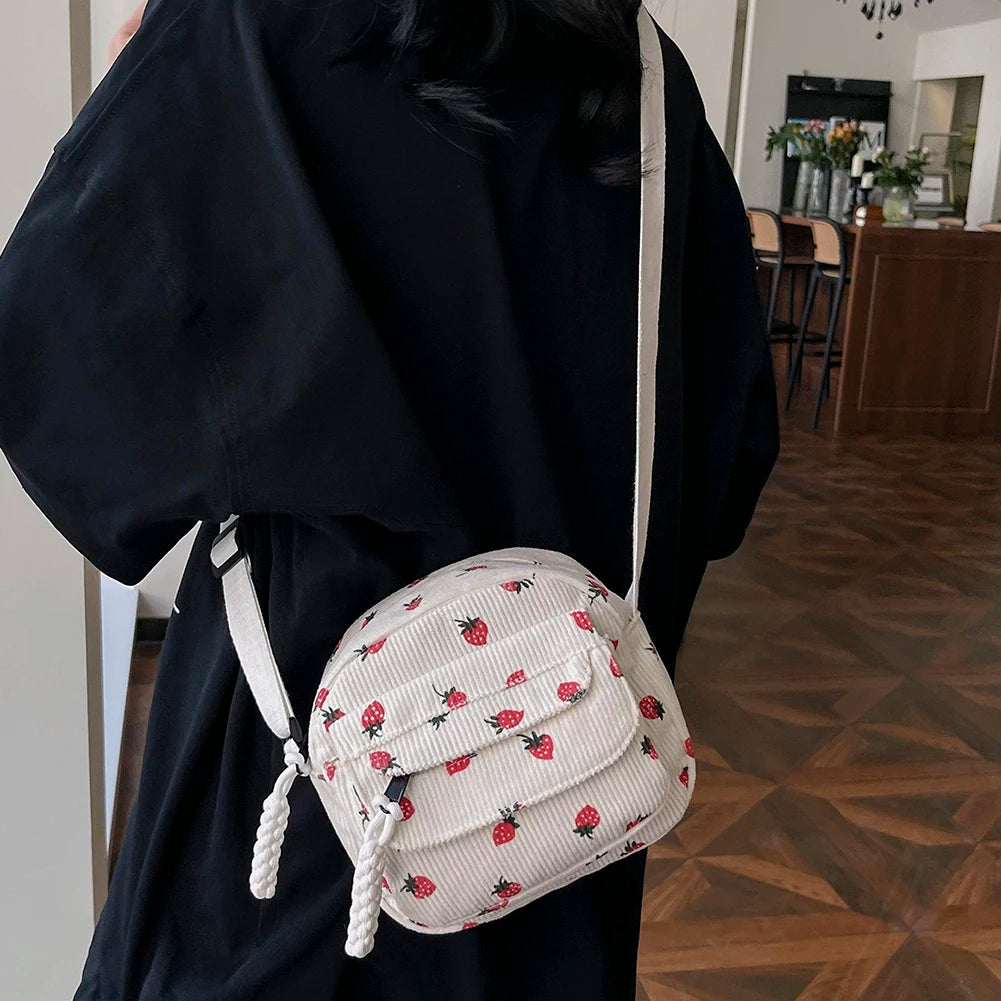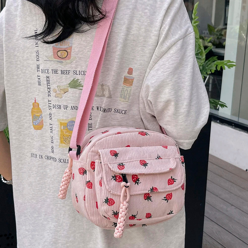 Indulge in the delightful textures of our Strawberry Sweetheart Crossbody Bag. Crafted with soft corduroy and adorned with a whimsical strawberry print, this bag adds a touch of playful elegance to your everyday style. It’s a small luxury that brings joy to your daily adventures.