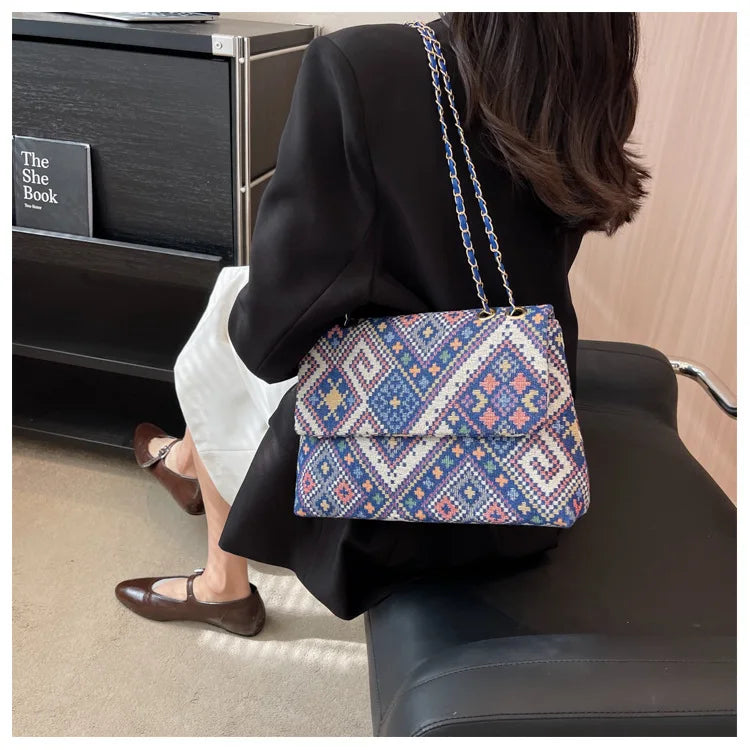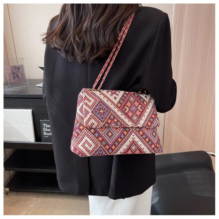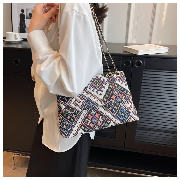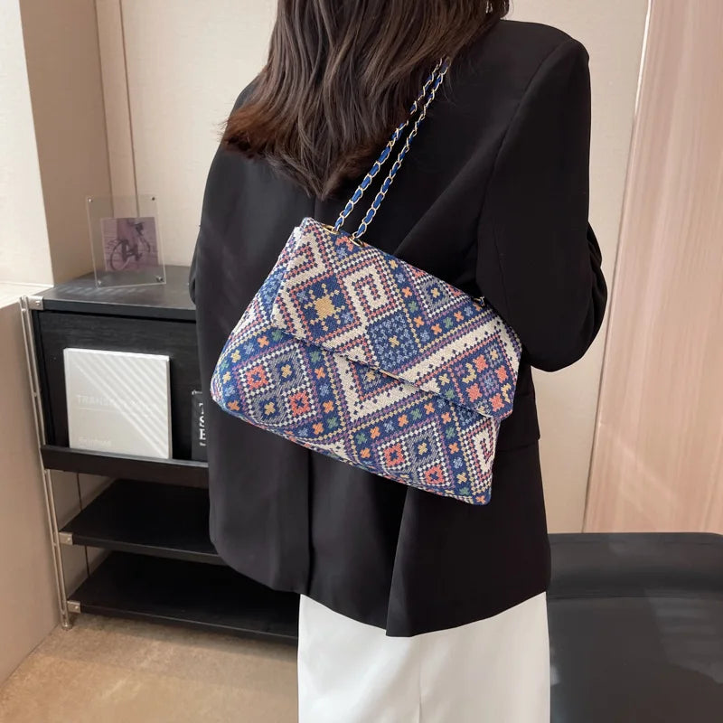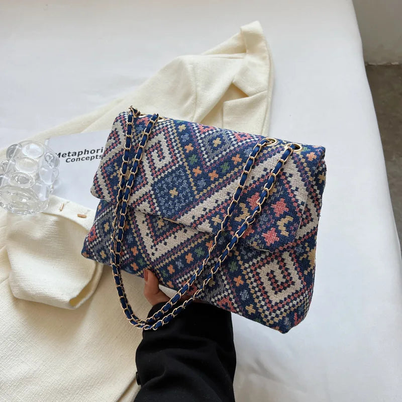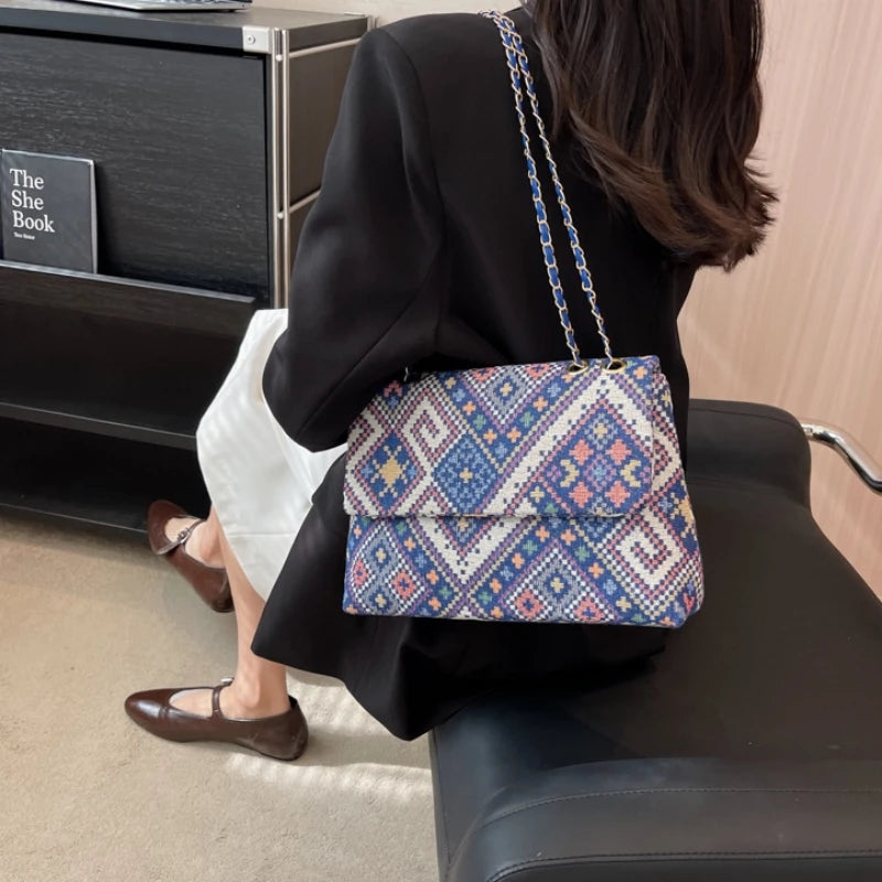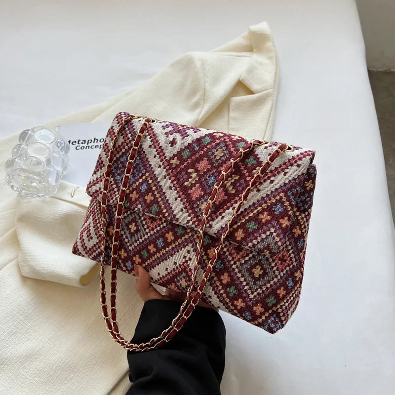 The Soul Stitch blends artisanal charm with everyday function. Its richly patterned fabric, spacious interior, and comfortable chain strap make it your go-to for errands, brunches, and everything in between.